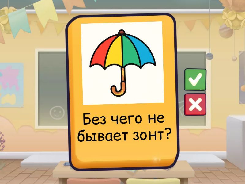 Без чего не бывает кактус? - колючки, Без чего не бывает снеговик? - снег, снежинки, Без чего не бывает черепаха? - панцирь, Без чего не бывает расчёска? - зубья, Без чего не бывает краб? - клешня, Без чего не бывает самолёт? - хвост, крыло, Без чего не бывает велосипед? - педаль, Без чего не бывает зонт? - ручка, Без чего не бывают санки? - полозья,