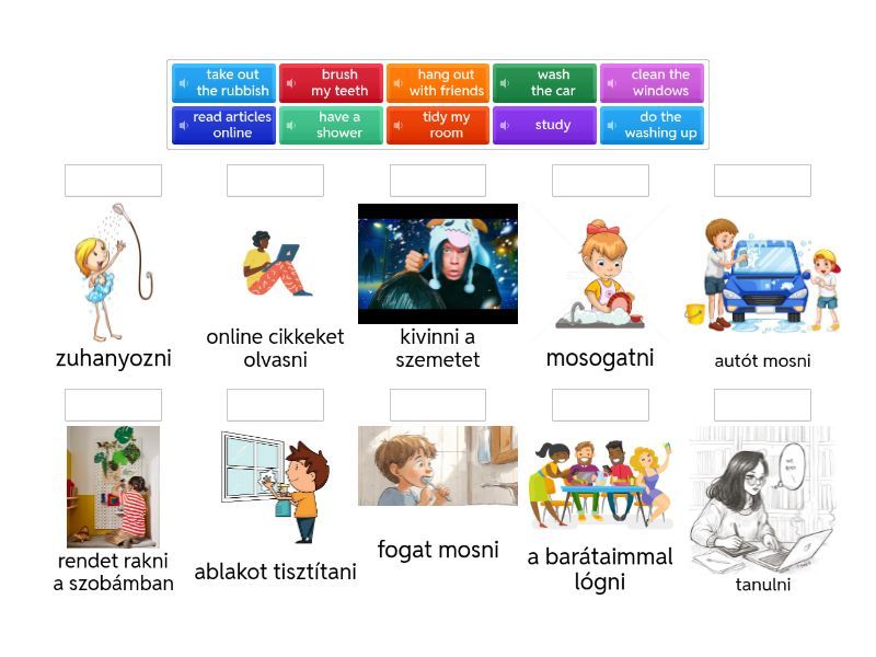 clean the windows - ablakot tisztítani, brush my teeth - fogat mosni, tidy my room - rendet rakni a szobámban, take out the rubbish - kivinni a szemetet, have a shower - zuhanyozni, hang out with friends - a barátaimmal lógni, wash the car - autót mosni, study - tanulni, do the washing up - mosogatni, read articles online - online cikkeket olvasni,