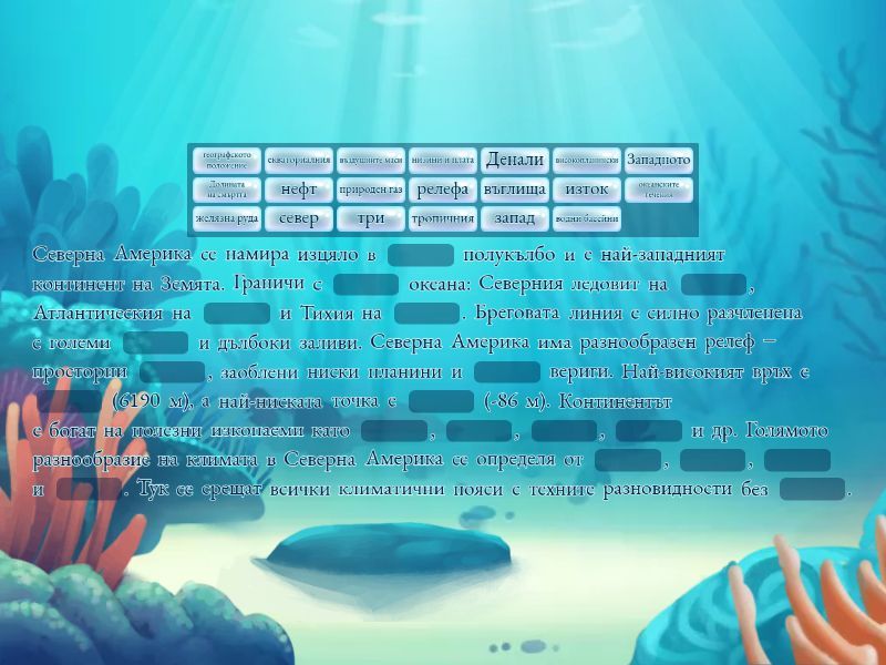 Северна Америка се намира изцяло в ____ полукълбо и е най-западният континент на Земята. Граничи с ____ океана: Северния ледовит на ____, Атлантическия на ____ и Тихия на ____. Бреговата линия е силно разчленена с големи ____ и дълбоки заливи. Северна Америка има разнообразен релеф – просторни ____, заоблени ниски планини и ____ вериги. Най-високият връх е ____ (6190 м), а най-ниската точка е ____ (-86 м). Континентът е богат на полезни изкопаеми като ____, ____, ____, ____ и др. Голямото разнообразие на климата в Северна Америка се определя от ____, ____, ____ и ____. Тук се срещат всички климатични пояси с техните разновидности без ____.