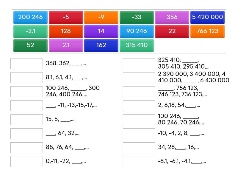 162 - 2, 6,18, 54,___,..., 14 - -10, -4, 2, 8, ___,..., -33 - 0,-11, -22, ___,..., -5 - 15, 5, ___,..., 22 - 34, 28,___, 16,..., 52 - 88, 76, 64, ___,..., 128 - ___, 64, 32,..., 356 - 368, 362, ___,..., -2.1 - -8.1, -6.1, -4.1,___,..., 2.1 - 8.1, 6.1, 4.1,___,..., -9 - ___, -11, -13,-15,-17,..., 5 420 000 - 2 390 000, 3 400 000, 4 410 000, ____ , 6 430 000, 315 410 - 325 410, _____, 305 410, 295 410,..., 90 246 - 100 246, _____, 80 246, 70 246,..., 200 246 - 100 246, _____, 300 246, 400 246,..., 766 123 - _____, 756 123, 746 123, 736 123,...,