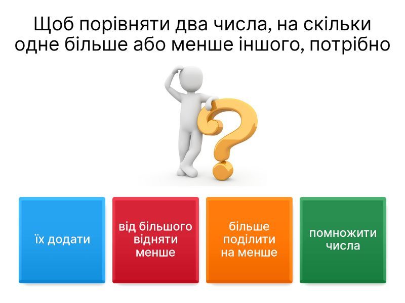 1) Щоб порівняти два числа, на скільки одне більше або менше іншого, потрібно a) їх додати b) від більшого відняти менше c) більше поділити на менше d) помножити числа 2) Обери потрібну дію. Більше на a) множення b) ділення c) додавання d) віднімання 3) Обери потрібну дію. Менше на a) ділення b) додавання c) множення d) віднімання 4) Щоб знайти периметр прямокутника, потрібно a) помножити довжини сторін b) додати довжини усіх сторін 5) 1 м дорівнює a) 10см b) 100см c) 1000см 6) 1 дм дорівнює a) 10см b) 1000мм c) 10мм 7) У виразах з дужками спочатку виконують ...?, а потім інші в порядку запису. a) дії в дужках b) додавання або віднімання за дужками