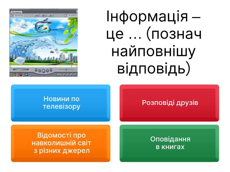 1) Інформація – це … (познач найповнішу відповідь) a) Новини по телевізору b) Розповіді друзів c) Відомості про навколишній світ з різних джерел d) Оповідання в книгах 2) Познач усі Дії, які можна виконувати з інформацією a) Отримання b) Зберігання c) Прибирання d) Опрацювання e) Передавання 3) Група з’єднаних між собою комп’ютерів – це … a) Комп’ютерна мережа b) Браузер c) Файл d) Сайт 4) Що розміщують на веб-сторінках для перегляду та використання? a) Тексти, зображення, музику, відео b) Одяг, гроші, телефон c) Іграшки, їжу, олівці 5) Програма, призначена для перегляду веб-сторінок - це ... a) Сайт b) Браузер c) Плагіат d) Авторське право 6) Оберіть пристрої введення інформації в комп'ютер a) мишка b) монітор c) навушники d) сканер e) клавіатура f) принтер 7) Файли на комп'ютері для зручності користування та пошуку групуються a) На диску b) У папки c) На робочому столі d) На флешці 8) Як захистити комп'ютер від вірусів? a) встановити антивірусну програму b) тримати комп'ютер в чистоті c) змінити комп'ютер на новий d) перед використаннням комп'ютера помити руки 9) Повідомлення за способом подання бувають a) текстові b) графічні c) звукові d) комбіновані e) прості і складні 10) Чи можна використовувати матеріали з Інтернету (зображення, тексти, відео) без згоди автора? a) Можна, якщо матеріал дуже потрібен b) Можна, але тільки для розваг c) Ні, використання чужої роботи без згоди автора є порушенням авторського права d) Можна, якщо автор твій знайомий