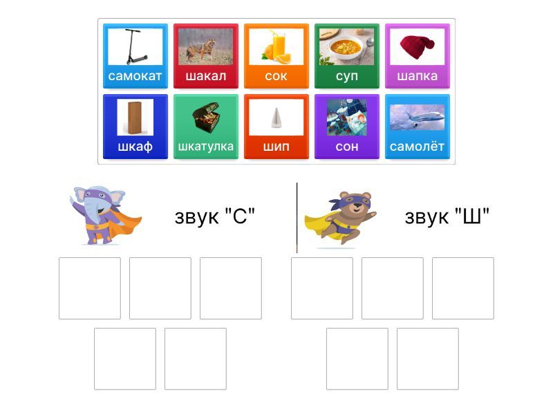 звук "С": сок, суп, самолёт, самокат, сон, звук "Ш": шапка, шип, шкаф, шакал, шкатулка,