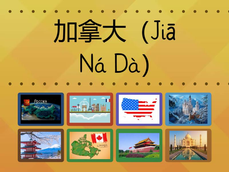 加拿大(Jiā Ná Dà), 美国 (Měi Guó), 法国(Fǎ Guó), 德国(Dé Guó), 日本(Rì běn), 俄罗斯(Éluósī), 印度 (Yìndù), 中国 (Zhōng guó),