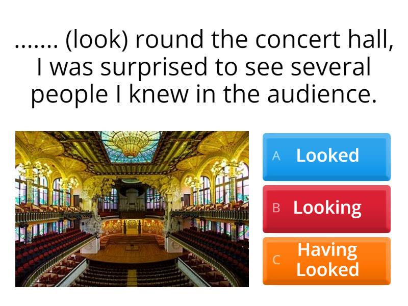 1) ....... (look) round the concert hall, I was surprised to see several people I knew in the audience. a) Looked b) Looking c) Having Looked 2) ........ (decide) not to go and play tennis, the two friends went out for a meal. a) Decided b) Deciding c) Having decided 3) ....... (build) 2,000 years ago, the Roman amphitheatre is still magnificent. a) Built b) Building c) Having built 4) ....... (know) by everyone as an outstanding speaker, it was no surprise when my uncle was chosen to deliver a public lecture. a) Known b) Knowing c) Having known 5) 'Underfunding is the reason for the youth employment scheme .......... (reach) crisis point over the last few weeks,' said the treasurer at the annual meeting. a) reached b) reaching c) having reached 6) ....... (view) through a telescope, the tall ship looked absolutely magnificent (not care) about who might overhear her, Caroline said exactly what she thought. a) Viewed b) Viewing c) Having viewed 7) ....... (not care) about who might overhear her, Caroline said exactly what she thought. a) Not cared b) Not caring c) Not having cared 8) ....... (stare) hard at the horizon, I could just make out the tallest of the mounitains. a) Staring b) Stared c) Having stared 9) ....... (write) 50 years ago the, novel addresses issues still of relevance today. a) Writing b) Written c) Having been written 10) ....... (find) that he had run out of money, Peter realised there was no point in staying in town any longer. (2 possible answers) a) Finding b) Found c) Having found 11) ....... (develop) a new type of drug, the researchers found it caused few side effects in patients. a) Developing b) Developed c) Having developed 12) ........ (not understand) what the instructor was saying, one student put his hand up to ask a question. a) Not understanding b) Not understood c) Not having understood