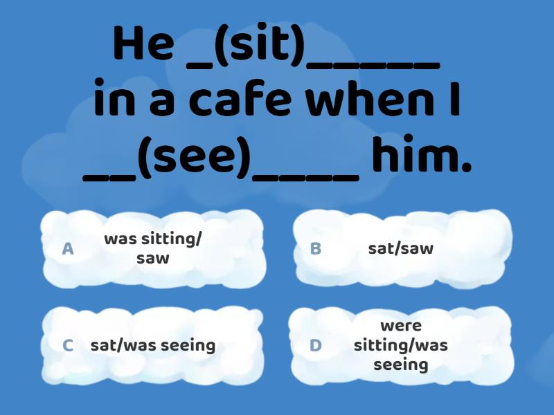 1) He _(sit)_____ in a cafe when I __(see)____ him. a) was sitting/ saw b) sat/saw c) sat/was seeing d) were sitting/was seeing 2) The boy __(fall)____ while he __(run)____. a) fell down/ran b) was falling down/was running c) fell down/was running d) was falling down/ran 3) When the war __(begin)____ we ______ in London. a) began/lived b) was beginning/was living c) began/were living d) was beginning/lived 4) The light __(go out)____ while I __(have)____ tea. a) went out/had b) went out/was having c) was going out/was having d) was going out/had 5) My friends ______ when I ______ into the room. a) were singing/come b) were singing/was coming c) sang/came d) were singing/came 6) He __(eat)____ his dinner when I __(call)____ him. a) ate/called b) ate/was calling c) was eating/was calling d) was eating/called 7) She ___(study)___at school when the earthquake _____(happen) ______ . a) study/happen b) was studying/was happenning c) was studying/happened d) studying/happened 8) When the phone __(ring)____ I (have) ______ a bath. a) rang/had b) was ringing/was having c) was ringing/had d) rang/was having 9) They (___ski)___ when they _____(see)_______ an avalanche. a) skied/seed b) was skiing / saw c) skied/ were seeing d) were skiing/ saw 10) The wildfire ______(arrive) while the people _____(sleep)_____.  a) arrive/ sleeped b) arrived/ was sleeping c) arrived/ were sleeping d) was arriving/ slept