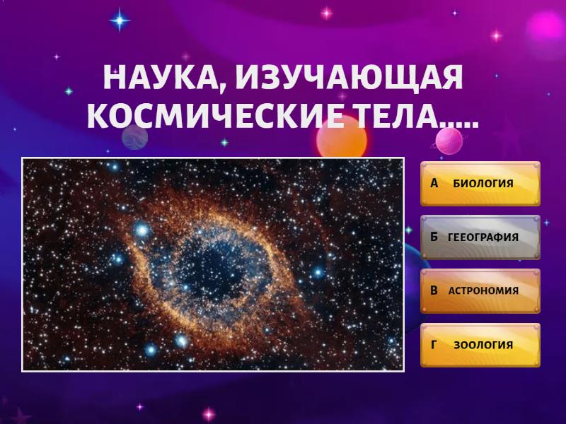 1) НАУКА, ИЗУЧАЮЩАЯ КОСМИЧЕСКИЕ ТЕЛА..... a) БИОЛОГИЯ b) ГЕЕОГРАФИЯ c) АСТРОНОМИЯ d) ЗООЛОГИЯ 2) НАША ГАЛАКТИКА НАЗЫВАЕТСЯ .... a) ЗВЕЗДНЫЙ ПУТЬ b) ЗВЕЗДНАЯ ДОРОГА c) МЛЕЧНЫЙ ПУТЬ d) МЛЕЧНАЯ ДОРОГА 3) ЧТО ТАКОЕ СОЛНЦЕ? a) ПЛАНЕТА b) КОМЕТА c) СОЗВЕЗДИЕ d) ЗВЕЗДА 4) ОТЧЕГО ПРОИСХОДИТ СМЕНА ДНЯ И НОЧИ? a) ЗЕМЛЯ ВРАЩАЕТСЯ ВОКРУГ СОЛНЦА b) ЗЕМЛЯ ВРАЩАЕТСЯ ВОКРУГ СВОЕЙ ОСИ c) ЛУНА ВРАЩАЕТСЯ ВОКРУГ ЗЕМЛИ d) ЛУНА ВРАЩАЕТСЯ ВОКРУГ СОЛНЦА 5) ЧТО ТАКОЕ ЛУНА? a) ЗВЕЗДА b) МАЛАЯ ПЛАНЕТА c) СПУТНИК СОЛНЦА d) СПУТНИК ЗЕМЛИ 6) КУДА УКАЗЫВАЕТ ПОЛЯРНАЯ ЗВЕЗДА a) НА СЕВЕР b) НА ЮГ c) НА ЗАПАД d) НА ВОСТОК 7) В КАКОМ СОЗВЕЗДИИ НАХОДИТСЯ ПОЛЯРНАЯ ЗВЕЗДА a) БОЛЬШАЯ МЕДВЕДИЦА b) МАЛАЯ МЕДВЕДИЦА c) МАЛЫЙ ПЕС d) ПЕРСЕЙ 8) СКОЛЬКО ПЛАНЕТ В СОЛНЕЧНОЙ СИСТЕМЕ a) 7 b) 8 c) 9 d) 10 9) КАКАЯ ИЗ ПЛАНЕТ САМАЯ БОЛЬШАЯ a) ЮПИТЕР b) САТУРН c) УРАН d) НЕПТУН 10) КАКУЮ ПЛАНЕТУ НАЗЫВАЮТ КРАСНОЙ? a) ВЕНЕРА b) ПЛУТОН c) ЗЕМЛЯ d) МАРС 11) СКОЛЬКО СПУТНИКОВ ИМЕЕТ МАРС a) 6 b) 2 c) 4 d) НЕТ СПУТНИКОВ 12) У КАКОЙ ПЛАНЕТЫ БОЛЬШЕ ВСЕГО СПУТНИКОВ a) САТУРН b) ЮПИТЕР c) УРАН d) ЗЕМЛЯ 13) САМАЯ ХОЛОДНАЯ ПЛАНЕТА a) НЕПТУН b) УРАН c) САТУРН d) МЕРКУРИЙ 14) САМАЯ ГОРЯЧАЯ ПЛАНЕТА a) ВЕНЕРА b) МЕРКУРИЙ c) МАРС d) ЗЕМЛЯ 15) ПОЧЕМУ ПРОИСХОДИТ СМЕНА ВРЕМЕН ГОДА a) ЗЕМЛЯ ВРАЩАЕТСЯ ВОКРУГ СОЛНЦА b) ЗЕМЛЯ ВРАЩАЕТСЯ ВОКРУГ СВОЕЙ ОСИ c) ВСЕ ПЛАНЕТЫ ВРАЩАЮТСЯ d) ЛУНА ВРАЩАЕТСЯ ВОКРУГ ЗЕМЛИ 16) ПУТЬ ПО КОТОРОМУ ДВИЖУТСЯ ПЛАНЕТЫ a) ОРБИТА b) КРАТЕР c) ТРАЕКТОРИЯ 17) ПЛАНЕТЫ ВНУТРЕННЕГО КРУГА a) МЕРКУРИЙ, ВЕНЕРА, ЗЕМЛЯ, МАРС b) МЕРКУРИЙ, МАРС, САТУРН, ПЛУТОН c) ВЕНЕРА, МАРС, ЗЕМЛЯ, УРАН d) ЮПИТЕР, САТУРН, УРАН, НЕПТУН 18) ЧТО ВХОДИТ В СОСТАВ СОЛНЕЧНОЙ СИСТЕМЫ a) СОЛНЦЕ, ПЛАНЕТЫ, СПУТНИКИ, АСТЕРОИДЫ, МЕТЕОРИТЫ, КОМЕТЫ , КОСМИЧЕСКАЯ ПЫЛЬ b) СОЛНЦЕ, ПЛАНЕТЫ И ИХ СПУТНИКИ c) ПЛАНЕТЫ, НЕБО, МЕТЕОРИТЫ, АСТЕРОИДЫ d) СОЛНЦЕ, КОМЕТЫ