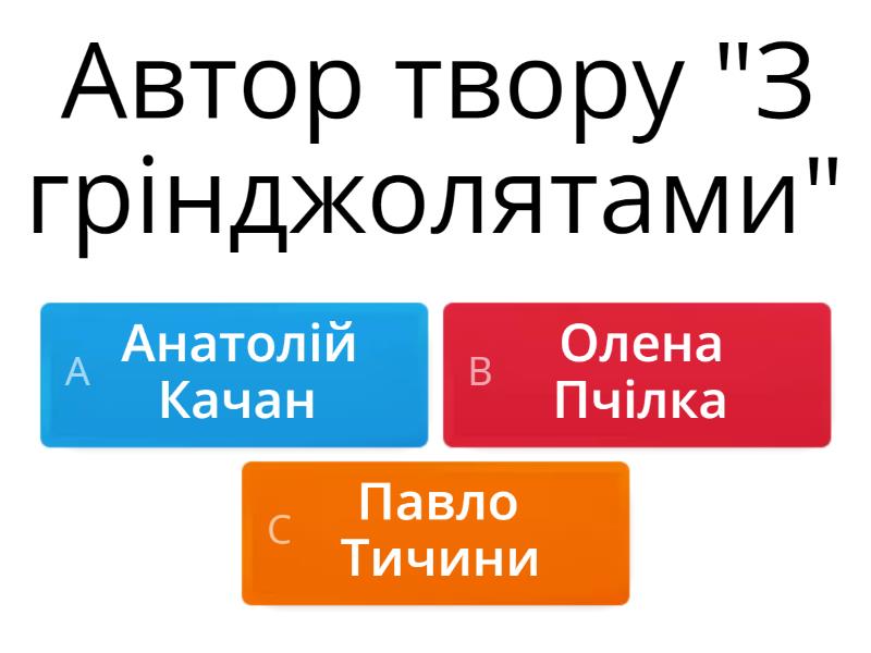 1) Автор твору "З грінджолятами" a) Анатолій Качан b) Олена Пчілка c) Павло Тичини 2) Перу Павла Тичини належить твір a) "З гринджолятами" b) "Хор лісових дзвіночків" c) " Море грає" 3) Автор твору "Цвітарінь" a) Оксана Іваненко b) Микола Вінграновський c) Марія Морозенко 4) Тема твору-це a) те, про що розповідає автор у творі b) головна думка, утілена у творі c) опис природи 5) Ідея твору-це a) те, про що розповідає автор у творі b) головна думка, утілена у творі c) опис природи 6) Найгостріший момент у творі a) Зав'язка b) Кульмінація c) Розв'язка 7) До позасюжетних елементів належить a) портрет b) епілог c) зав'язка 8) Анімалістичним називається оповідання, в якому розповідається про a) природу b) тварин c) пригоди 9) Жанр твору "Вірність Хатіко" a) казка b) вірш c) оповідання 10) Тема твору "Гусенятко" a) Розповідь про небезпечний і тяжкий світ пташиного життя b) Розповідь про вірність і дружбу між людиною і собакою