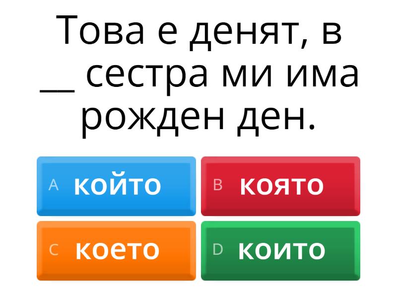 1) Това е денят, в __ сестра ми има рожден ден. a) който b) която c) което d) които 2) Това е мястото, на __ се запознахме. a) който b) която c) което d) които 3) Мъжът, с __ говорих, беше мой съученик. a) който b) когото c) които 4) Какво да правим? - Няма значение, __ и да е. a) какъвто b) каквато c) каквото d) каквито 5) Кой чай искаш? - Няма значение, __ и да е. a) който b) която c) което d) които 6) Кога да се срещнем? - Няма значение, __ и да е. a) който b) където c) когато d) както