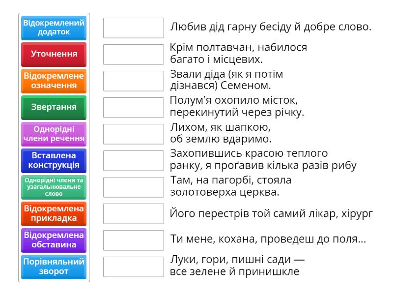 Відокремлене означення - Полум’я охопило місток, перекинутий через річку., Звертання - Ти мене, кохана, проведеш до поля..., Відокремлена обставина - Захопившись красою теплого ранку, я проґавив кілька разів рибу, Однорідні члени речення - Любив дід гарну бесіду й добре слово., Відокремлений додаток - Крім полтавчан, набилося багато і місцевих., Відокремлена прикладка - Його перестрів той самий лікар, хірург, Порівняльний зворот - Лихом, як шапкою, об землю вдаримо., Однорідні члени та узагальнювальне слово - Луки, гори, пишні сади — все зелене й принишкле, Уточнення - Там, на пагорбі, стояла золотоверха церква., Вставлена конструкція - Звали діда (як я потім дізнався) Семеном.,