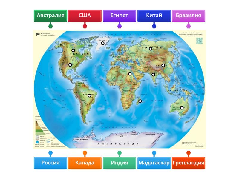 Россия, США, Канада, Австралия, Бразилия, Китай, Индия, Гренландия, Египет , Мадагаскар.
