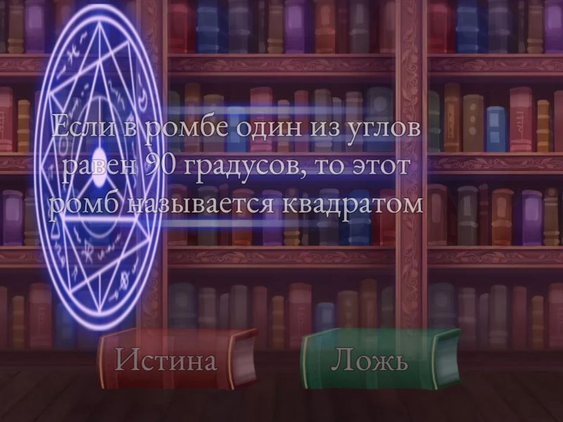 Истина: Если в ромбе один из углов равен 90 градусов, то этот ромб называется квадратом , Если два угла одного треугольника равны двум углам другого треугольника, то треугольники подобны, Если диагонали выпуклого четырёхугольника равны и перпендикулярны, то этот четырёхугольник является квадратом, Если диагонали параллелограмма равны, то это прямоугольник, Если стороны одного четырёхугольника соответственно равны сторонам другого четырёхугольника, то такие четырёхугольники равны, Если точка лежит на биссектрисе угла, то она равноудалена от сторон этого угла, Касательная к окружности перпендикулярна радиусу, проведённому в точку касания, Любой квадрат является прямоугольником, Любой прямоугольник можно вписать в окружность, Если диагонали параллелограмма перпендикулярны, то этот параллелограмм является ромбом, Любые два диаметра окружности пересекаются, Любые два равносторонних треугольника подобны, Один из углов треугольника всегда не превышает 60 градусов, Основания любой трапеции трапеции параллельны, Площадь квадрата равно произведению двух его смежных сторон, Площадь параллелограмма равна половине произведения его диагоналей, Площадь прямоугольника равно произведению длин его смежных сторон, Площадь ромба равна произведению двух его смежных сторон на синус угла между ними, Площадь ромба равно произведению его стороны на высоту, проведенную к этой стороне, Площадь ромба равна произведению его стороны на высоту, проведённую к этой стороне, Площадь треугольника меньше произведения двух его сторон, Расстояние от точки, лежащей на окружности, до центра окружности равно радиус, Средняя линия трапеции параллельна ее основаниям, Средняя линия трапеции равно полусумма ее оснований , Сумма острых углов прямоугольного треугольника равна 90 градусам, Сумма углов выпуклого четырёхугольника равна 360 градусам, Ложь: Если в треугольнике есть один острый угол, то этот треугольник остроугольный, Если две стороны и угол одного треугольника равны соответственно двум стором и углу другого треугольника, то такие треугольники равны, Если две стороны одного треугольника соответственно равны двум сторонам другого треугольника, то такие треугольники равны, Если диагонали параллелограмма равны, то этот параллелограмм является квадратом, Если диагонали параллелограмма равны, то этот параллелограмм является ромбом, Если три угла одного треугольника равны соответственно трем углам другого треугольника, то такие треугольники равны, Если угол острый, то смежный с ним угол так же является острым, Каждая из биссектрис равнобедренного треугольника является его высотой, Каждая из биссектрис равнобедренного треугольника является его медианой, Касательная к окружности параллельна радиусу, проведённому в точку касания, Косинус острого угла прямоугольного треугольника равен отношению гипотенузы к прилежащему к этому углу катету, Любой параллелограмм можно вписать в окружность, Медиана треугольника делит пополам угол, из вершины которого проведена, Основания равнобедренной трапеции равны, Отношения площадей подобных треугольников равно коэффициенту подобия, Площадь любого параллелограмма равна произведению длин его сторон, Площадь прямоугольника равна произведению длин всех его сторон, Площадь трапеции равна произведе