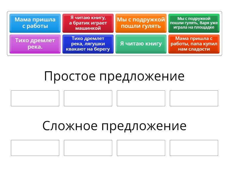 Простое предложение: Тихо дремлет река., Я читаю книгу, Мама пришла с работы, Мы с подружкой пошли гулять, Сложное предложение : Тихо дремлет река, лягушки квакают на берегу, Я читаю книгу, а братик играет машинкой, Мама пришла с работы, папа купил нам сладости, Мы с подружкой пошли гулять, Варя уже играла на площадке,