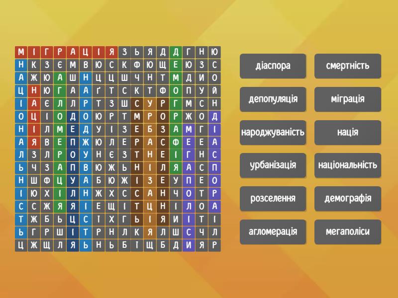 демографія - демографія, діаспора - діаспора, міграція - міграція, народжуваність - народжуваність, смертність - смертність, депопуляція - депопуляція, урбанізація - урбанізація, агломерація - агломерація, мегаполіси - мегаполіси, нація - нація, національність - національність, розселення - розселення,