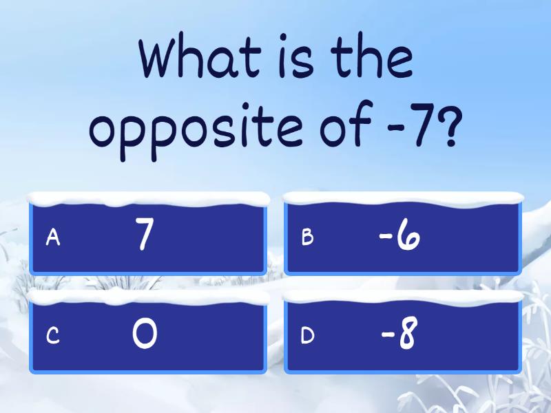 1) What is the opposite of -7? a) 7 b) -6 c) 0 d) -8 2) What is the sum of 5 and -3? a) 2 b) -2 c) 8 d) 3 3) Which of the following is a positive integer? a) -9 b) 0 c) -1 d) 12 4) If you subtract -5 from 3, what is the result? a) 8 b) 2 c) -2 d) 0 5) If you multiply -6 by 2, what is the result? a) -12 b) 12 c) 8 d) -8 6) What is -8 + (-4)? a) 8 b) -12 c) 6 d) 4 7) What is the opposite of the integer 15? a) 5 b) 6 c) -15 d) 3 8) If you subtract 4 from -10, what do you get? a) -6 b) -14 c) 14 d) 6 9) What is the result of (-4)²? a) 16 b) 8 c) -16 d) -8 10) If -2 is multiplied by an integer, the result is 0. What is that integer? a) 2 b) 0 c) -2 d) -1