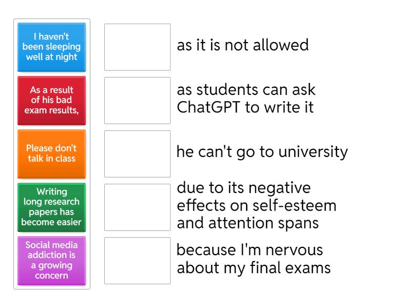 As a result of his bad exam results, - he can't go to university , I haven't been sleeping well at night - because I'm nervous about my final exams, Writing long research papers has become easier - as students can ask ChatGPT to write it, Please don't talk in class - as it is not allowed, Social media addiction is a growing concern  - due to its negative effects on self-esteem and attention spans,