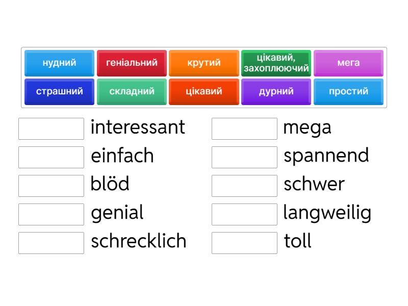 мега - mega, цікавий - interessant, крутий - toll, простий - einfach, цікавий, захоплюючий - spannend, геніальний - genial, страшний - schrecklich, нудний - langweilig, дурний - blöd, складний - schwer,
