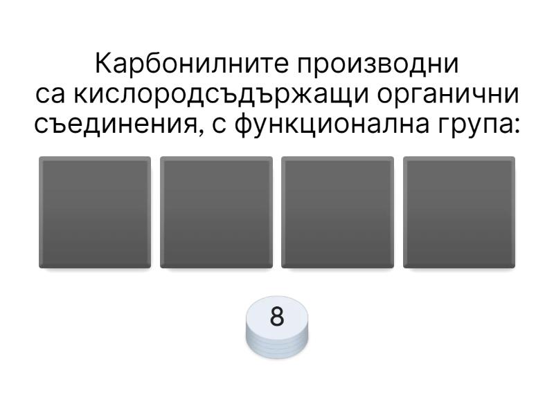 1) Карбонилните производни са кислородсъдържащи органични съединения, с функционална група: a) -СООН b) -ОН c) >С=О d) -NН2 2) При алдехидите карбонилната група е в: a) в края на въглеводородната верига b) началото на веригата (при първия въглероден атом) и е свързана с водороден атом c) е свързана с два еднакви или различни въглеводородни остатъка. d) е свързана с два еднакви или различни въглеводородни остатъка и се нарича кетонна група. 3) Наименованията на съединенията са: a) ацетон, бензалдехид, ацеталдехид b) формалин, ацетон, метилфенилкетон c) ацеталдехид, ацетон, бензалдехид d) формалдехид, ацеталдехид, пропионов алдехид 4) Реакцията е позната като: a) окисление на алдехид b) сребърно огледало c) качествена реакция за откриване на кетони d) реакция на горене 5) Какъв е видът на съединението СН3СОСН3? a) алкохол b) алдехид c) кетон d) карбоксилна киселина 6) Какъв е видът на процеса, означен с уравнението: a) неутрализация b) естерификация c) хидролиза d) ферментация 7) Какъв процес е естерификацията? a) бавен, молекулен, необратим b) бавен, молекулен, обратим c) бърз, йонен, необратим d) бърз, молекулен, обратим 8) Кои функционални групи могат да се докажат с прясно утаен Cu(OH)2? a) алдехидна и карбоксилна b) съседни хидроксилни и алдехидна c) амино и кетонна d) карбоксилна и хидроксилна 9) Кои реакции са характерни за карбонилните съединения? a) нуклеофилно присъединяване b) естерификация 10) Коя е функционалната група на карбоксилните съединения? a) b) –ОН c) –NH2 d) 11) Коя е формулата на бензоената киселина? a) НСООН b) C2Н5ОН c) С6Н5СООН d) CН3СООН 12) Какъв е видът на съединението СН3СHО? a) алкохол b) алдехид c) кетон d) карбоксилна киселина 13) Кое от съединенията във воден разтвор е слаба киселина? a) глицерол b) етиленгликол c) фенол d) метанол 14) Кое от съединенията е алдехид? a) b) c) d) 15) Кой реактив може да се използва за доказване на алдехид в хранителен продукт? a) амонячен разтвор на Ag2O b) воден разтвор на FeCl3 c) воден разтвор на AgNO3 d) лакмус 16) Кое свойство НЕ е характерно за алдехидите? a) присъединяване на водород b) дисоциация в разтвор c) горене d) окисление от прясно утаен Cu(OH)2 17) Коя киселина се използва за производство на аспирин? a) оксалова b) салицилова c) оцетна d) стеаринова 18) За разлика от солната киселина, оцетната киселина: a) гори b) взаимодейства с основи c) оцветява лакмуса в червено d) взаимодейства с активни метали 19) Естер на кой алкохол се използва за направа на динамит, както и в медицината за регулиране на сърдечната дейност? a) етанол b) метанол c) глицерол d) етиленгликол 20) Към кой клас съединения спада a) ненаситена карбоксилна киселина b) наситена карбоксилна киселина c) едновалентен алкохол d) многовалентен алкохол