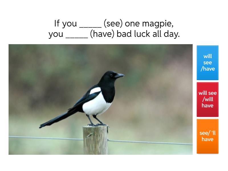 1) If you _____ (see) one magpie, you _____ (have) bad luck all day.  a) will see /have b) will see /will have c) see/ ‘ll have 2) It _____ (bring) good luck if you _____ (see) more than one magpie.  a) bring /will see b) will bring /see c) will bring /will see 3) If you _____ (open) an umbrella inside the house, it _____ (bring) bad luck .  a) will open /bring b) will open /will bring c) open /will bring 4) If you _____ (find) a spider in your house, someone _____ (visit) you soon.  a) will find /visit b) will find /will visit c) find /will visit 5) If you _____ (say) goodbye to a friend on a bridge, you _____ (never see) each other again.  a) will say /will never see b) will say /never see c) say /will never see 6) You _____ (not get) unwelcome visitors if you _____ (put) a brush behind the front door.  a) won’t get/ put b) won’t get/ will put c) don’t get/ will put 7) If fishermen _____ (not put back) the first fish they catch each morning, they _____ (not catch) many fish that day.  a) won't put back/won’t catch b) won't put back/don’t catch c) don’t put back/won’t catch
