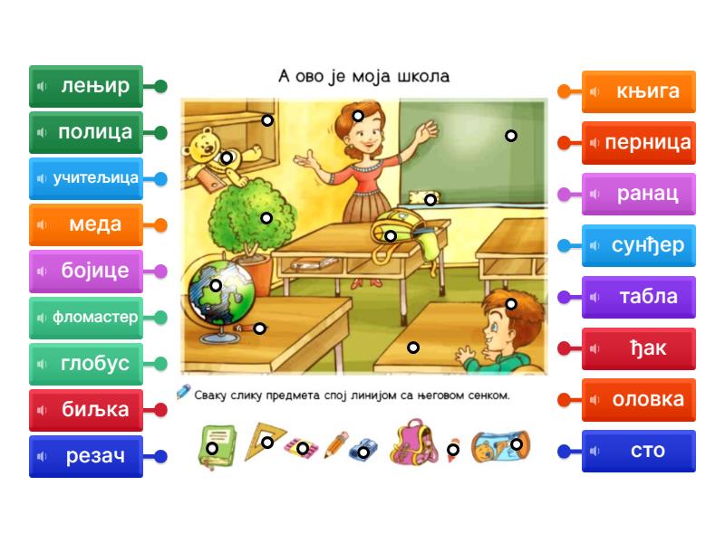 учитељица, ђак, меда, полица, ранац, сто, глобус, оловка, табла, сунђер, биљка, књига, лењир, бојице, резач, фломастер, перница.