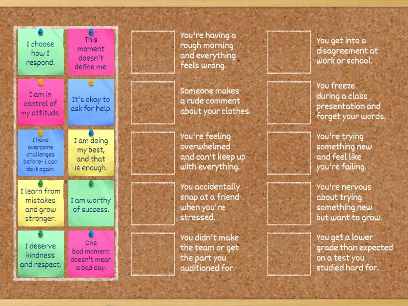 This moment doesn't define me. - You freeze during a class presentation and forget your words., I am doing my best, and that is enough. - You get a lower grade than expected on a test you studied hard for., I choose how I respond. - You accidentally snap at a friend when you're stressed., I learn from mistakes and grow stronger. - You're trying something new and feel like you're failing., I deserve kindness and respect. - Someone makes a rude comment about your clothes., I am worthy of success. - You didn't make the team or get the part you auditioned for., It's okay to ask for help. - You're feeling overwhelmed and can't keep up with everything., I am in control of my attitude. - You get into a disagreement at work or school., One bad moment doesn't mean a bad day. - You're having a rough morning and everything feels wrong., I have overcome challenges before- I can do it again. - You're nervous about trying something new but want to grow.,