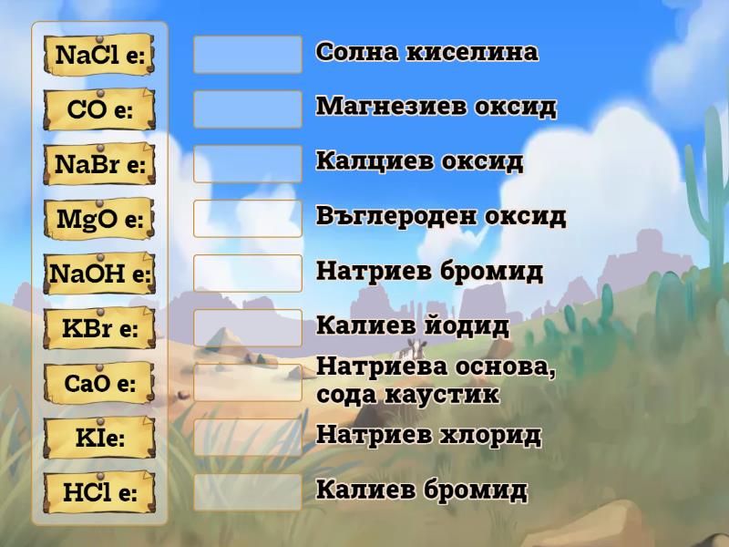 NaBr е: - Натриев бромид, СаО е:  - Калциев оксид, MgO е: - Магнезиев оксид, KIе: - Калиев йодид, NaCl е: - Натриев хлорид, NaOH е: - Натриева основа, сода каустик, HCl е: - Солна киселина, KBr е: - Калиев бромид, CO е: - Въглероден оксид,