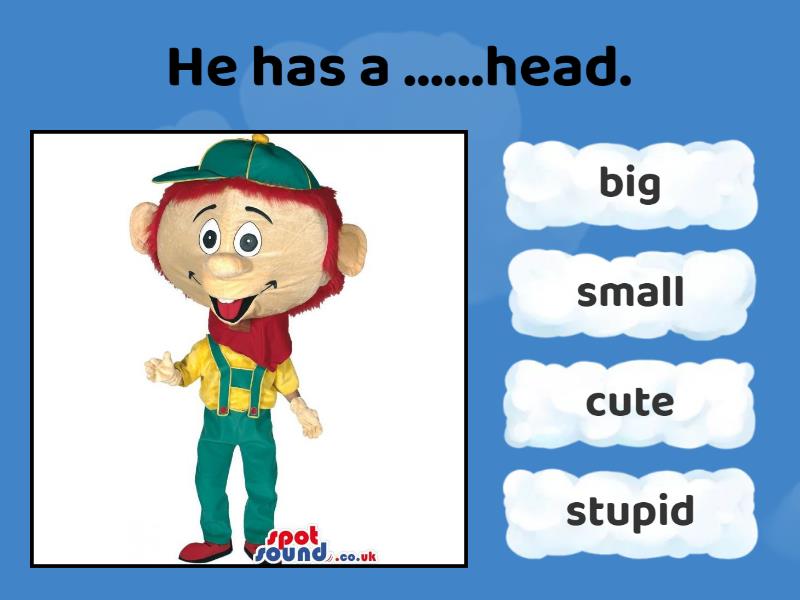 1) He has a ......head. a) big b) small c) cute d) stupid 2) She has got a .....black dress  a) long b) little c) tasty d) funny 3) It has got ...... ears. a) big b) long c) small d) soft 4) He is wearing a .......jacket . a) hungry b) nice c) empty d) fair 5) They have got ......heads. a) smart b) pretty c) sad d) happy 6) This school has got ......students. a) smart b) clever c) silly d) easy 7) I like ......classical music. a) quick b) short c) noisy d) quiet 8) The Math test was ...... a) tasty b) smart c) easy d) stupid 9) We have got .....day. a) lovely b) hard c) pretty d) young 10) The pillow is very ..... a) soft b) old c) funny d) merry 11) He asks ......questions a) young b) silly c) fat d) thick 12) She looks ..... a) fair b) stupid c) wonderful d) young 13) Is this cake.... a) narrow b) wide c) tasty d) slim 14) Are the chips salty? a) sweet b) hot c) cold d) salty 15) .....Christmas! a) sad b) funny c) merry d) happy 16) Big Ben is a..... English a) empty b) narrow c) short d) tall 17) This pen is ..... a) thick b) thin c) fat d) slim 18) I'm.... a) thick b) thin c) fat d) old 19) My cat is... a) slim b) old c) fat d) cold 20) His sister is......and .... a) fat and old b) thi and short c) slim and young d) big and funny 21) The street is very ... a) barrow b) wide c) hot d) large 22) The path is ...... a) narrow b) big c) short d) large 23) He gave me a ...... teddy  a) warm b) old c) large d) tasty