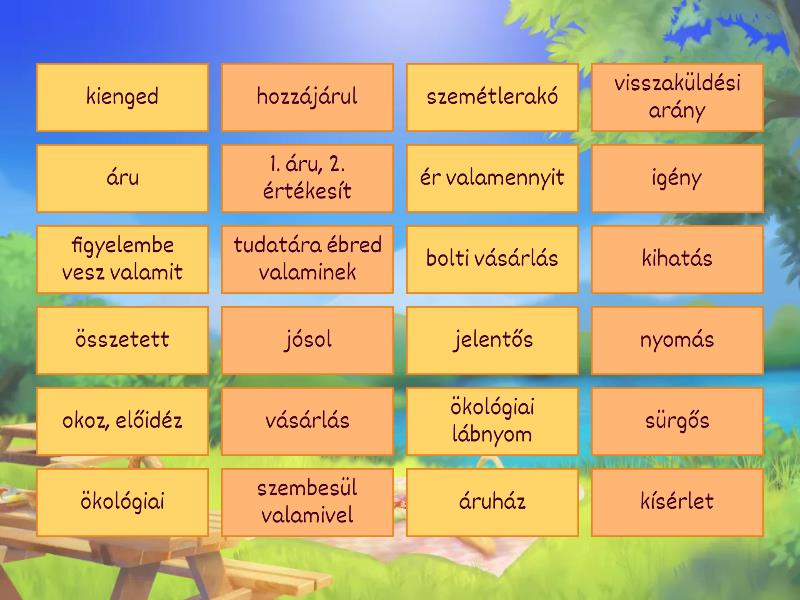 szemétlerakó - landfill, kísérlet - attempt, hozzájárul - to contribute, ökológiai lábnyom - carbon footprint, okoz, előidéz - to genetate, kihatás - impact, vásárlás - purchase, áru - goods, ökológiai - ecological, áruház - department store, jósol - predict, bolti vásárlás - in-store shopping, jelentős - significant, összetett - complex, ér valamennyit - to be worth, 1. áru, 2. értékesít - (to) merchandise, kienged - to release, visszaküldési arány - return-rate, figyelembe vesz valamit - to take something into consideration, szembesül valamivel - to face with something, nyomás - pressure, tudatára ébred valaminek - to become aware of sth., igény - demand, sürgős - urgent,