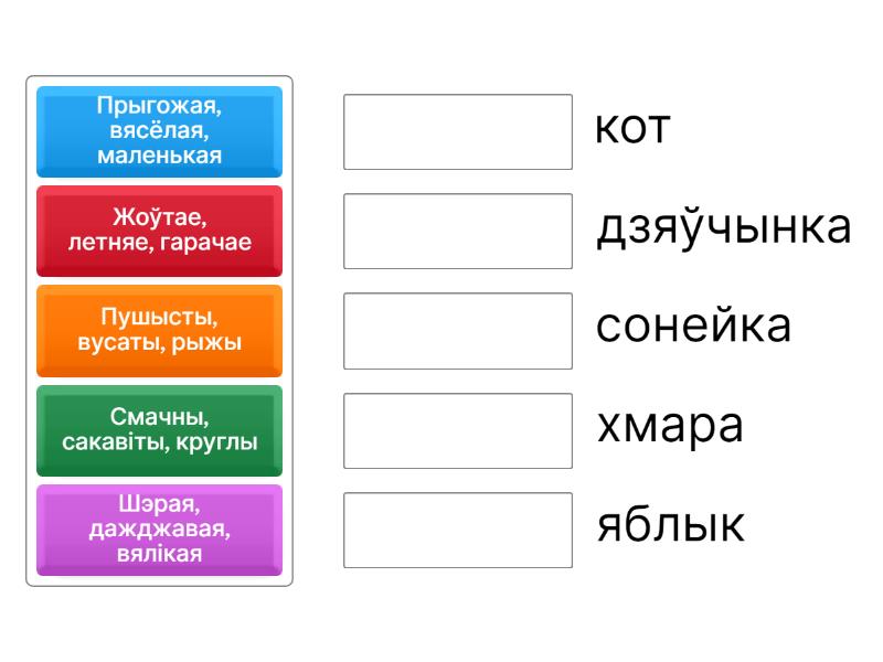 Жоўтае, летняе, гарачае - сонейка, Смачны, сакавіты, круглы - яблык, Пушысты, вусаты, рыжы - кот, Прыгожая, вясёлая, маленькая - дзяўчынка, Шэрая, дажджавая, вялікая - хмара,