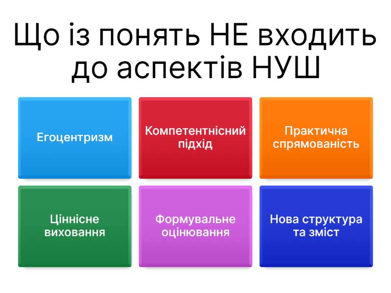 1) Що із понять НЕ входить до аспектів НУШ a) Егоцентризм b) Компетентнісний підхід c) Практична спрямованість d) Ціннісне виховання e) Формувальне оцінювання f) Нова структура та зміст 2) Ким не повинен бути сучасний учитель? a) ментором b) коучем c) тьютором d) новатором e) консерватором f) фасилітатором 3) Скільки ключових компетентностей НУШ? a) 8 b) 12 c) 10 d) 5