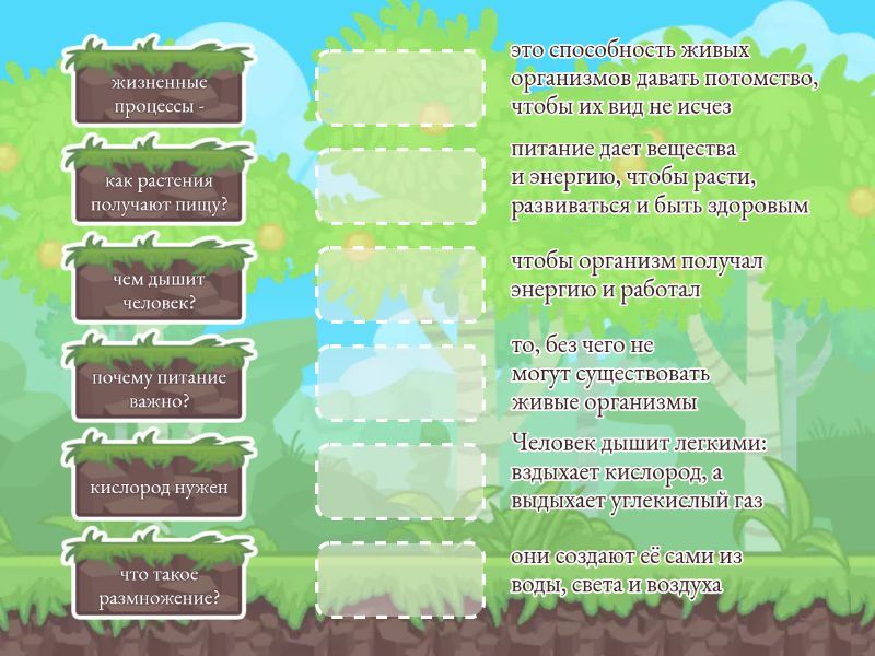 жизненные процессы - - то, без чего не могут существовать живые организмы, кислород нужен - чтобы организм получал энергию и работал, чем дышит человек? - Человек дышит легкими: вздыхает кислород, а выдыхает углекислый газ , как растения получают пищу? - они создают её сами из воды, света и воздуха, почему питание важно? - питание дает вещества и энергию, чтобы расти, развиваться и быть здоровым , что такое размножение? - это способность живых организмов давать потомство, чтобы их вид не исчез,
