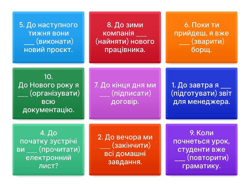 1. До завтра я ___ (підготувати) звіт для менеджера. - підготую, 2. До вечора ми ___ (закінчити) всі домашні завдання. - закінчимо, 4. До початку зустрічі ви ___ (прочитати) електронний лист? - прочитаєте, 5. До наступного тижня вони ___ (виконати) новий проєкт. - виконають, 6. Поки ти прийдеш, я вже ___ (зварити) борщ. - зварю, 7. До кінця дня ми ___ (підписати) договір. - підпишемо, 8. До зими компанія ___ (найняти) нового працівника. - найме, 9. Коли почнеться урок, студенти вже ___ (повторити) граматику. - повторять, 10. До Нового року я ___ (організувати) всю документацію. - організую,