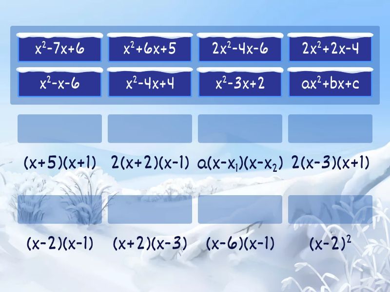 x2-7x+6 - (x-6)(x-1), x2-x-6 - (x+2)(x-3), x2-3x+2 - (x-2)(x-1), x2+6x+5 - (x+5)(x+1), x2-4x+4 - (x-2)2, 2x2-4x-6 - 2(x-3)(x+1), 2x2+2x-4 - 2(x+2)(x-1), ax2+bx+c - a(x-x1)(x-x2),