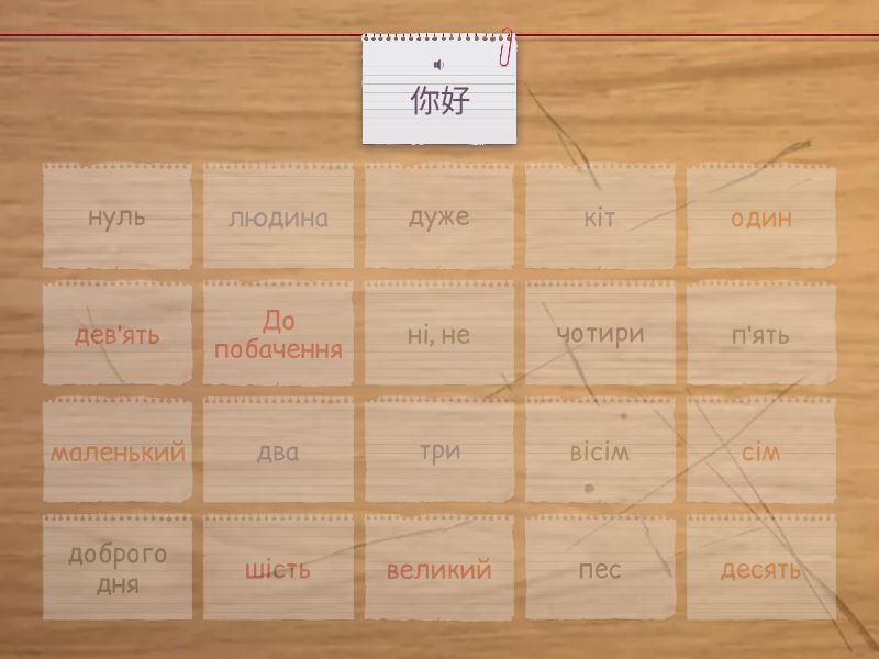 доброго дня - 你好, До побачення  - 再见, один - 一, два - 二, нуль - 〇, п'ять - 五, шість - 六, сім - 七, три - 三, чотири - 四, вісім - 八, дев'ять - 九, десять - 十, кіт - 猫, пес - 狗, ні, не - 不, великий - 大, маленький - 小, людина - 人, дуже - 很,