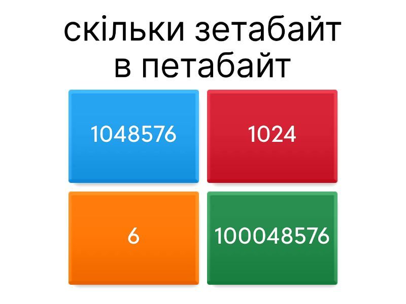 1) скільки зетабайт в петабайт a) 1048576 b) 1024 c) 6 d) 100048576