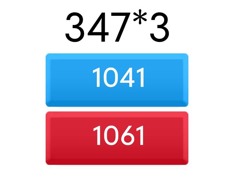 1) 347*3 a) 1041 b) 1061 2) 562*24 a) 15 488 b) 13 488 3) 715*309 a) 230 935 b) 220 935 4) 70*5 a) 350 b) 300 5) 400:80 a) 5 b) 50 6) 28*4 a) 212 b) 112 7) 900:3 a) 300 b) 30 8) 60*20 a) 1200 b) 120 9) 98*5 a) 480 b) 490 10) 96 512:2 a) 48 256 b) 47 256