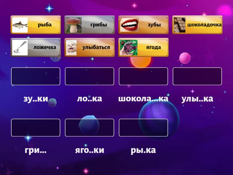 рыба - ры.ка, зубы - зу..ки, грибы - гри..., ягода - яго..ки, ложечка - ло..ка, шоколадочка - шокола...ка, улыбаться - улы..ка,