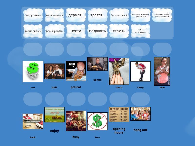 наслаждаться - enjoy, проводить время, тусоваться - hang out, подавать - serve, часы открытия - opening hours, бронировать - book, загруженный, заполненный - busy, стоить - cost, бесплатный - free, трогать - touch, держать - hold, нести - carry, терпеливый - patient, сотрудники - staff,