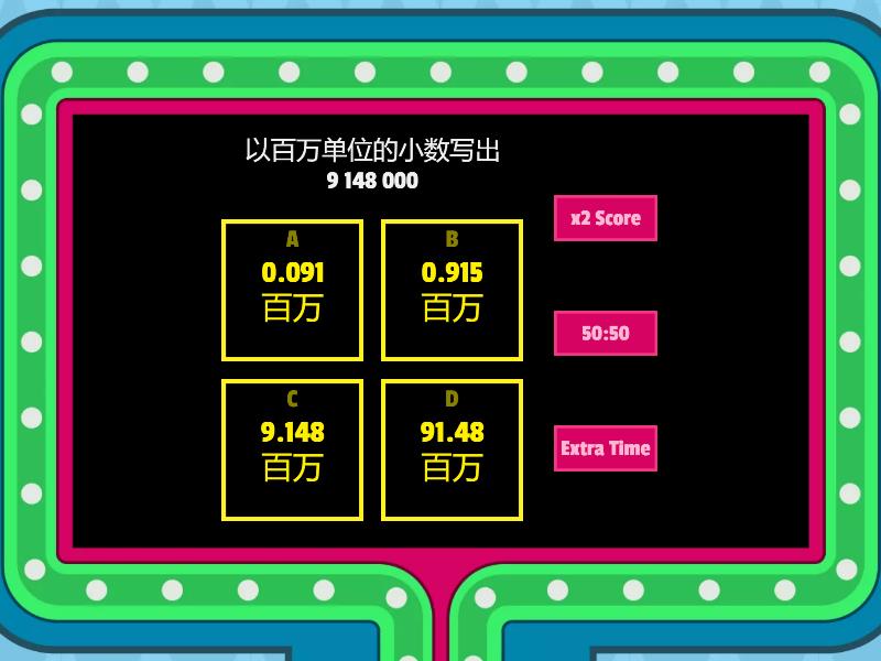 1) 以百万单位的小数写出 9 148 000 a) 0.091 百万 b) 0.915 百万 c) 9.148 百万 d) 91.48 百万 2) 以百万单位的小数写出 9 000 。 a) 0.009 百万 b) 9 百万 c) 0.9 百万 d) 0.09 百万 3) 以百万单位的小数写出 98 000 。 a) 9.8 百万 b) 0.098 百万 c) 0.98 百万 d) 98 百万 4) 以百万单位的分数写出 9 500 000 。 a) 9 1/2 百万 b) 9 1/5百万 c) 5/9 百万 d) 9/5百万 5) 以百万单位的分数写出 200 000 。 a) 1/2百万 b) 1/5 百万 c) 1/10 百万 d) 2/5 百万 6) 以整数写出 9.26 百万。 a) 926 000 b) 9 260 000 c) 92 600 d) 9 260 7) 以整数写出 1 1/5百万 a) 200 000 b) 1 500 000 c) 1 400 000 d) 1 200 000 8) 以整数写出 3/8 百万 a) 375 000 b) 3 800 000 c) 37 500 d) 375