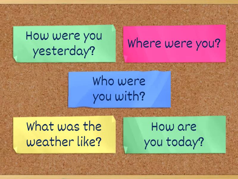 How were you yesterday?, Where were you?, Who were you with?, What was the weather like?, How are you today?,
