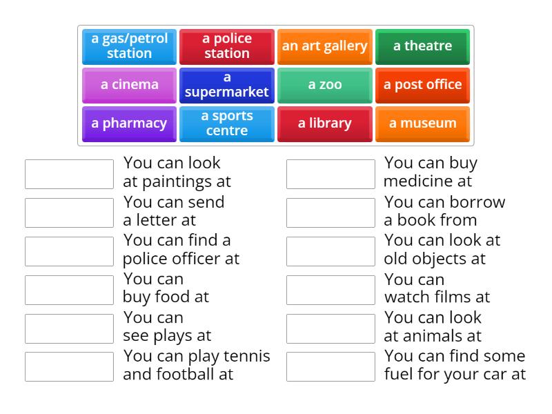 an art gallery - You can look at paintings at, a post office - You can send a letter at, a police station - You can find a police officer at, a supermarket  - You can buy food at , a theatre - You can see plays at, a sports centre - You can play tennis and football at, a pharmacy - You can buy medicine at, a library - You can borrow a book from, a museum  - You can look at old objects at, a cinema - You can watch films at, a zoo - You can look at animals at, a gas/petrol station - You can find some fuel for your car at,