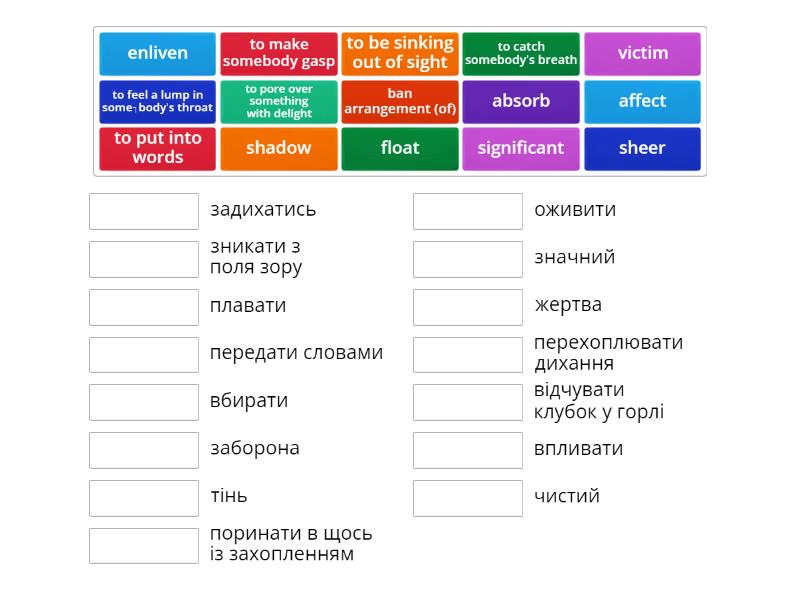 ban arrangement (of) - заборона,  shadow - тінь, victim - жертва, absorb - вбирати, affect - впливати, enliven - оживити, float - плавати, sheer - чистий, significant - значний, to catch somebody’s breath - перехоплювати дихання, to feel a lump in somebody’s throat - відчувати клубок у горлі, to make somebody gasp - задихатись, to pore over something with delight - поринати в щось із захопленням, to put into words - передати словами, to be sinking out of sight - зникати з поля зору,
