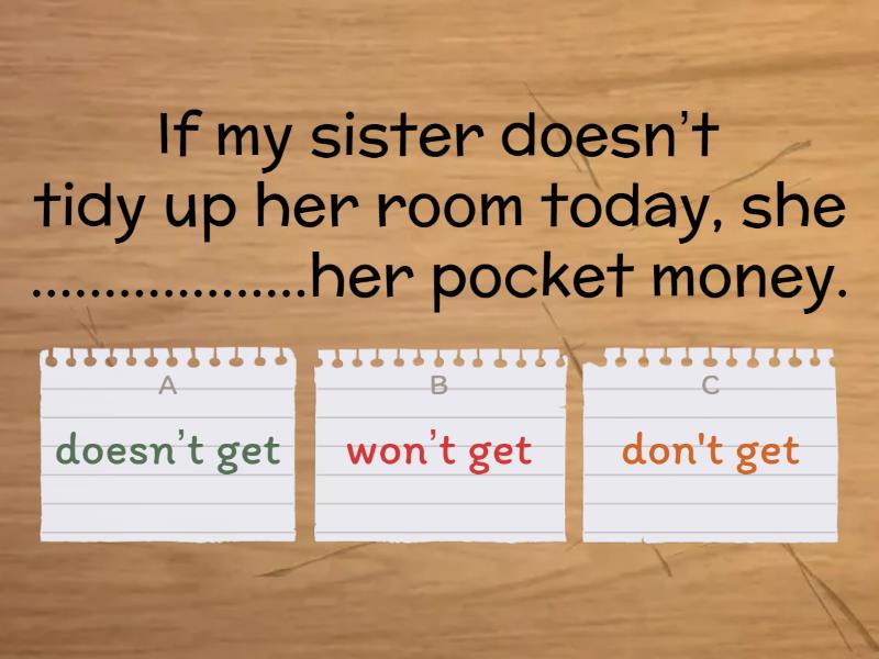 1) We ...................... the party at Tom’s house if his parents agree. a) have b) ’ll have c) has 2) Jodie ...................... Martin about the party if he asks. It’s a secret! a) doesn’t tell b) won’t tell c) don't tell 3) When the party ......................., we’ll all tidy up. a) finishes b) will finish c) finish 4) Will you buy me a new bike ................ I pass all my exams, Dad? a) unless b) if 5) If my sister doesn’t tidy up her room today, she ...................her pocket money. a) doesn’t get b) won’t get c) don't get 6) We’ll start the test ................... everyone is here. a) unless b) when  7) I won’t speak to my sister .................she says sorry for taking my bike. a) unless b) if 8) If I ................. this Science test, my parents will be very angry with me. a) fail b) will fail c) fails 9) You won't have enough money for a holiday ............... you don't get a job. a) if b) unless 10) My mum will be angry ................ I phone her. a) unless b) if