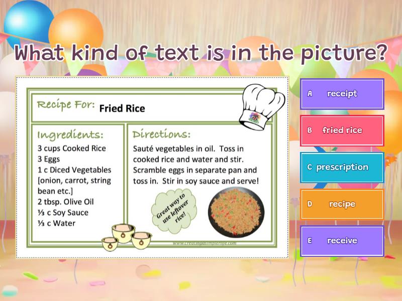 1) What kind of text is in the picture? a) receipt b) fried rice c) prescription d) recipe e) receive 2) what recipe that the writer wants to cook? a) fried rice b) fried onion c) fried chicken d) fried egg e) fried noodle 3) cooked rice, egg, vegetables, etc., are categorized as? a) purpose b) materials c) ingredients d) methods e) title 4) what are included in "directions" process? a) methods/actions on how to execute the recipe b) the ingredients used in the recipe c) the materials used in the recipe d) the goal the writer wants to do e) the purpose on what to do 5) based on the text, we can see the structure of the text are............. a) ingredients, goal, methods/directions b) methods, goal, ingredients c) goal, ingredients, directions/methods d) methods, ingredients, goal e) directions, goal, ingredient 6) Unhealthy habits! a) sleeping late/staying up late b) smoking c) less physical activity d) diet and exercise e) eating junk food 7) Chose the tips on how to lose weight! a) Never skip breakfast b) always think positively c) don't eat too close to bedtime d) skip lunch e) move everyday 8) The following are some definition of tips? Except a) a useful information b) advice c) guidance d) avoidance e) useful instruction 9) What are tips for? a) to ask useful information b) to give useful information c) to give consequences d) to get consequences e) to ask for steps sequences 10) How are the tips constructed in a text? a) by stating goal and steps b) by stating goal, materials, and steps c) by stating materials and steps d) by stating goal and materials e) by stating goal, ingredients, and steps