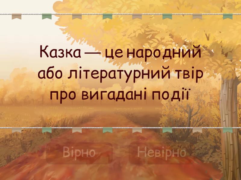 Вірно: Казка — це народний або літературний твір про вигадані події, "Жили собі дід і баба..." - це зачин казки, "От вам казка, а мені бубликів в'язка" - це кінцівка казки, У казці Заєць глузував над Їжачком, Заєць бігав навипередки 99 разів, Казка навчає ніколи не сміятися зі слабшого, У казках тварини вміють розмовляти, Їжак і Заєць бігали наввипередки, Невірно: Казки поділяються на чотири групи, Нива - це засіяний ліс, "Як їжак і заєць бігали навипередки" належить до чарівної групи казок, Кривуляєш, криволапко, так говорили про зайчика, Їжак і Заєць бігали на швидкість за капустою,