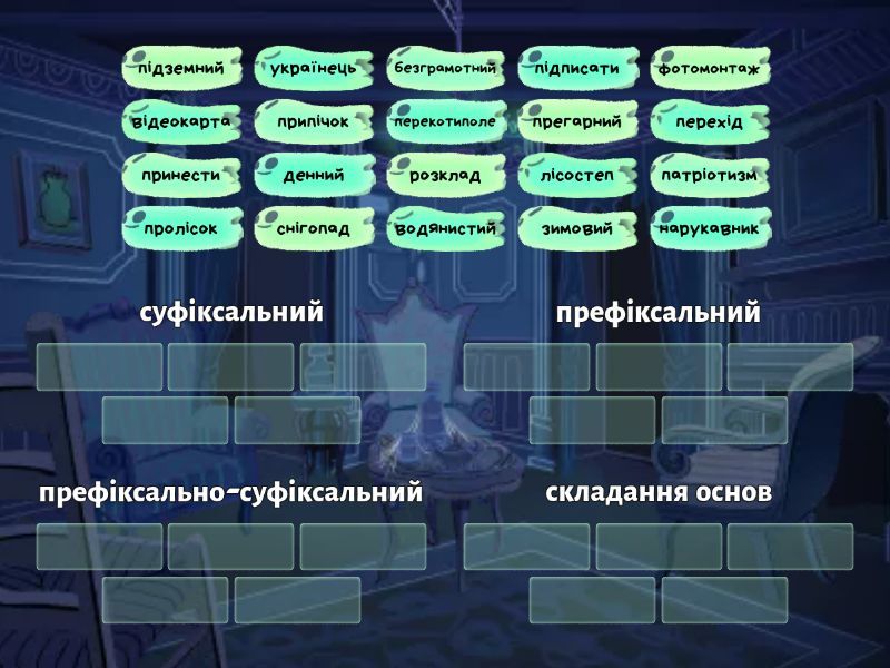 суфіксальний: зимовий, водянистий, українець, патріотизм, денний, префіксальний: принести, підписати, прегарний, перехід, розклад, префіксально-суфіксальний: припічок, безграмотний, пролісок, підземний, нарукавник, складання основ: снігопад, лісостеп, перекотиполе, фотомонтаж, відеокарта,