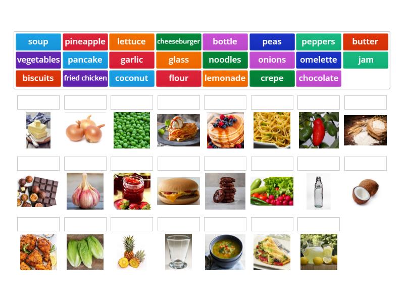 onions, lettuce, chocolate, biscuits, flour, omelette, peas, pancake, pineapple, peppers, coconut, fried chicken, jam, butter, noodles, soup, cheeseburger, crepe, lemonade, vegetables, garlic, glass, bottle,