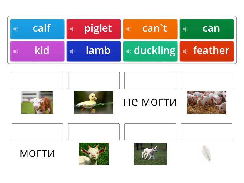 piglet, lamb, kid, duckling, calf, feather, can - могти, can`t - не могти,