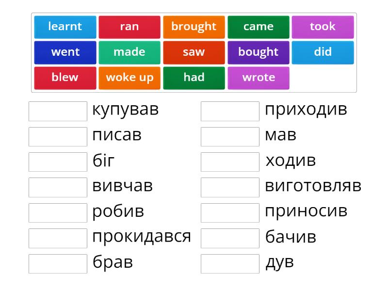 came - приходив, did - робив, saw - бачив, went - ходив, learnt - вивчав, had - мав, wrote - писав, blew - дув, brought - приносив, took - брав, bought - купував, made - виготовляв, ran - біг, woke up - прокидався,