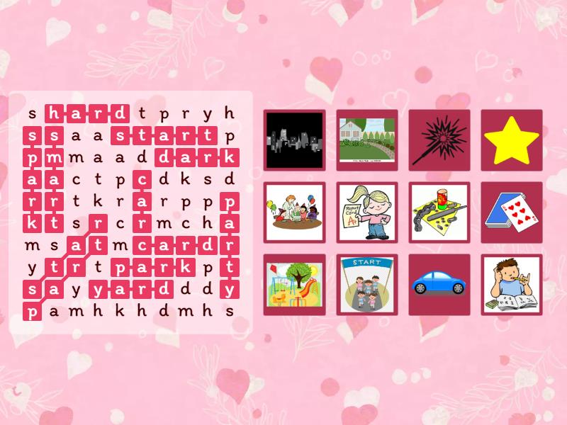 car, dark, card, star, park, yard, party, hard, smart, start, part, spark,